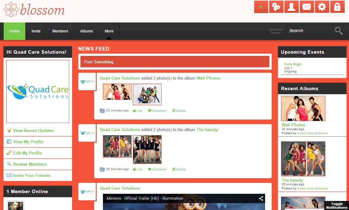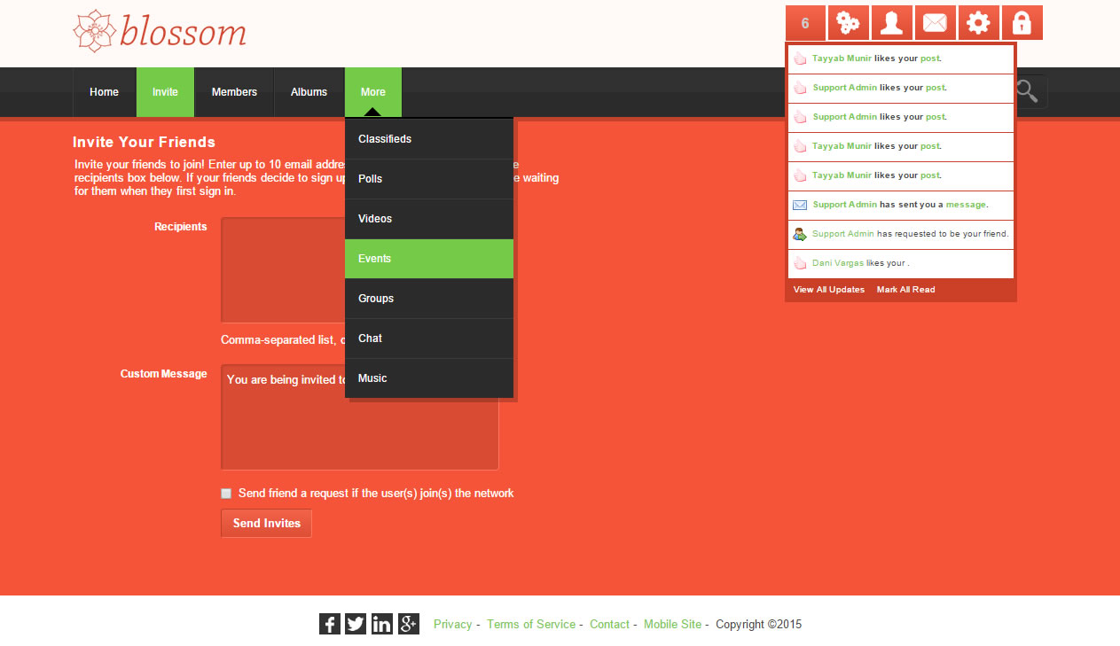 Blossom theme is designed and created for SocialEngine PHP v5. It is attractive, modern, beautiful and user friendly. No any change required in SocialEngine PHP core code for installation.