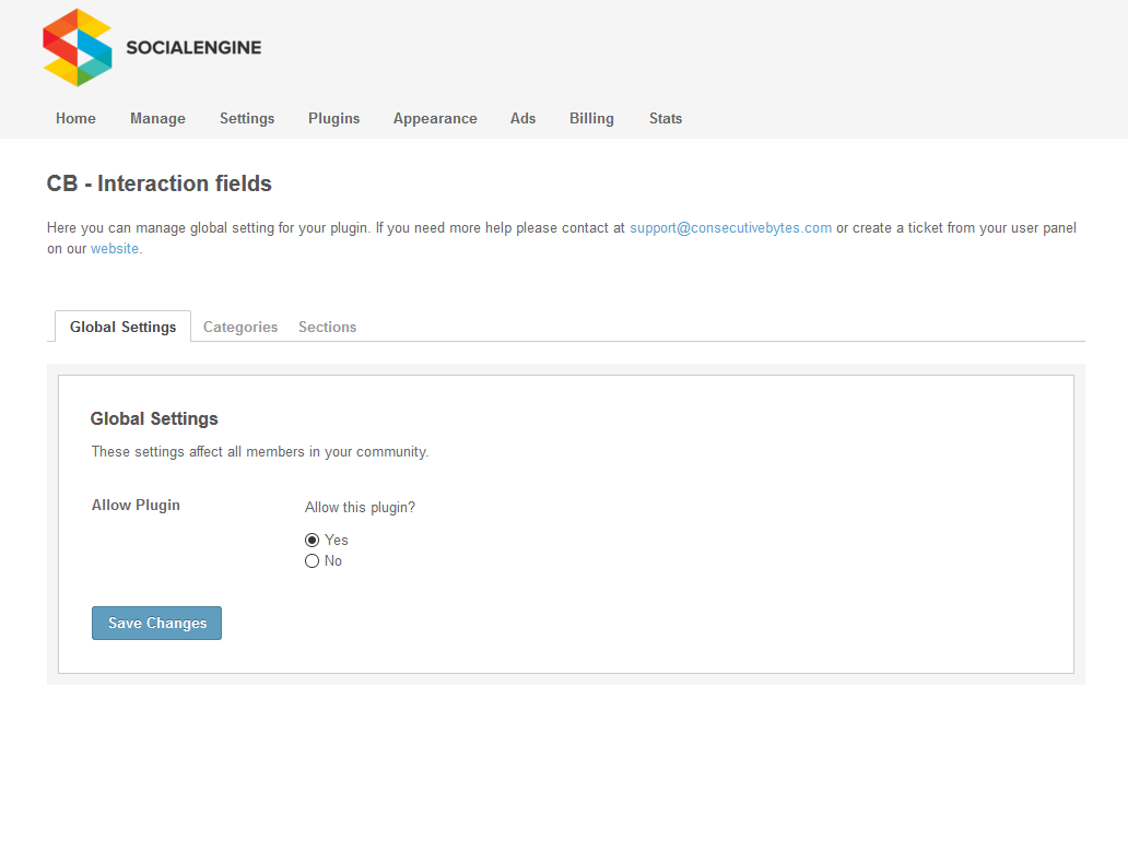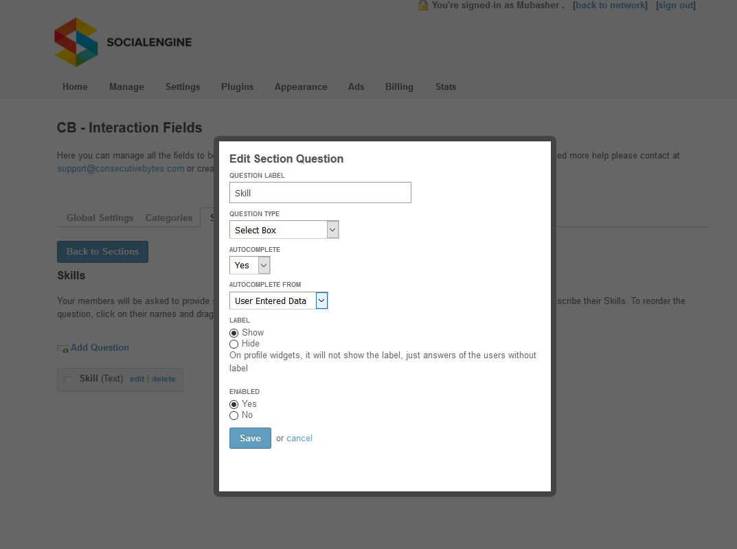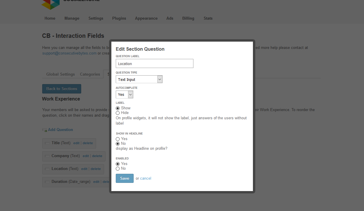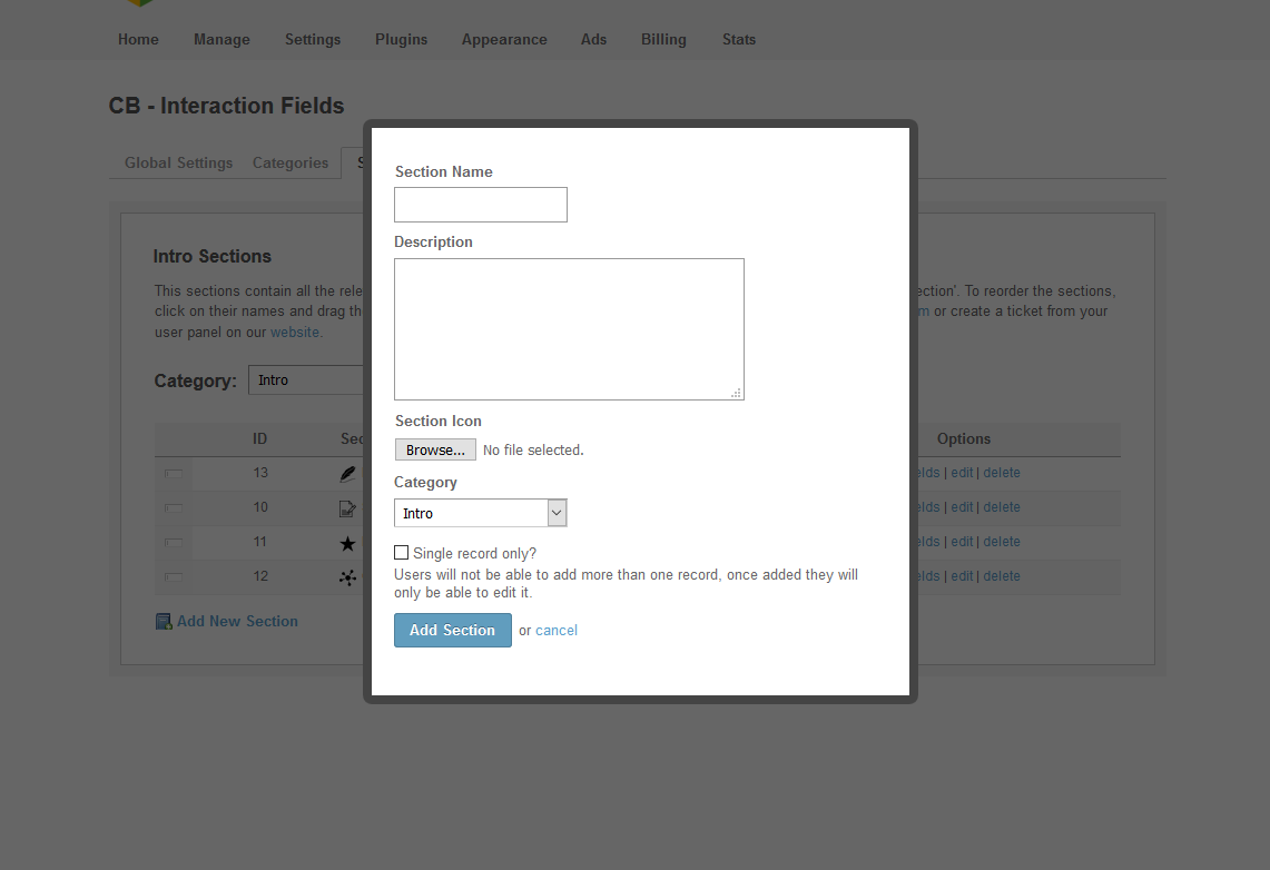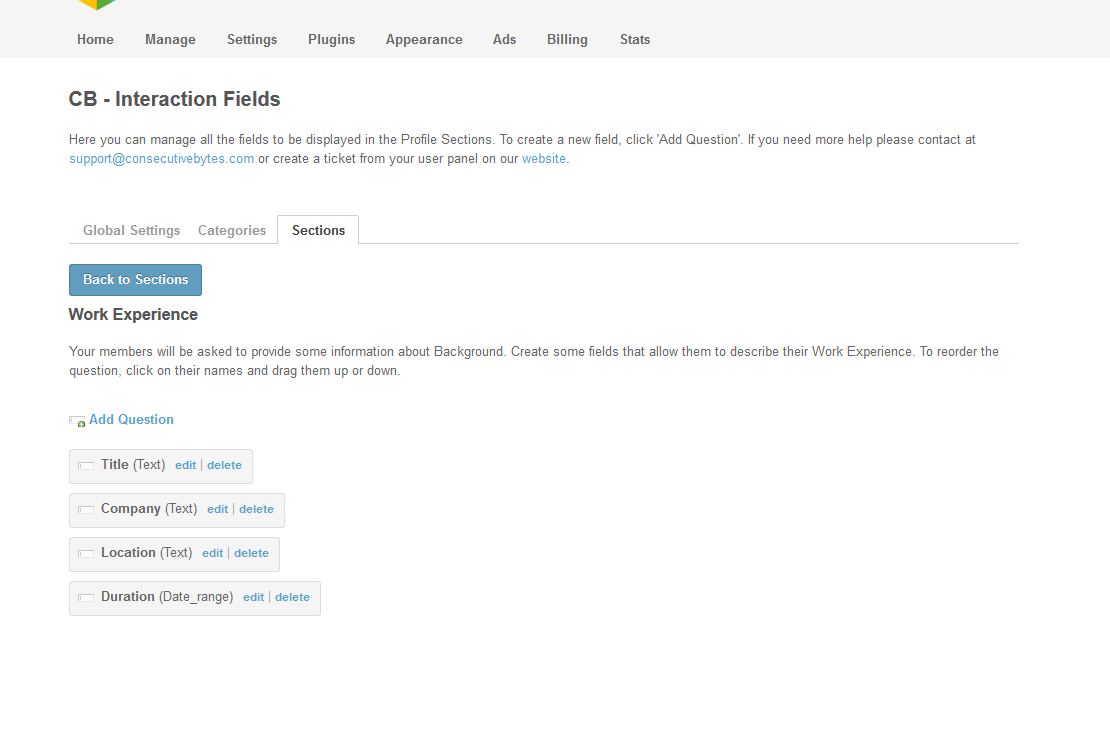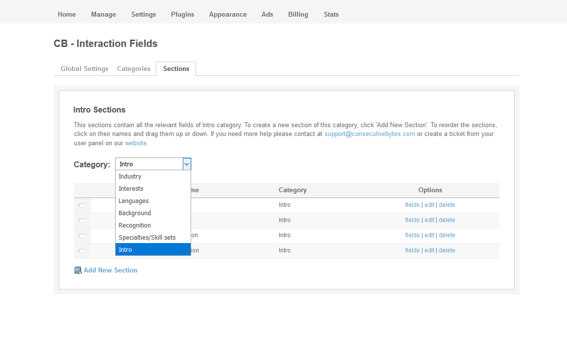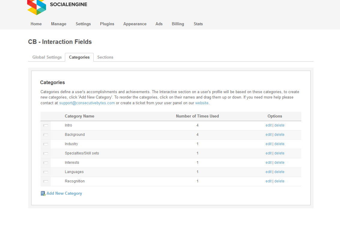 Sections can be categories based in your SocialEngine member profile, such as when you install the plugin, you will be able to edit or delete any category you wish. Categories are great way to group the sections for users. You can also drag and change the ordering of the categories and it will show in that order on your socialEngine member profile.