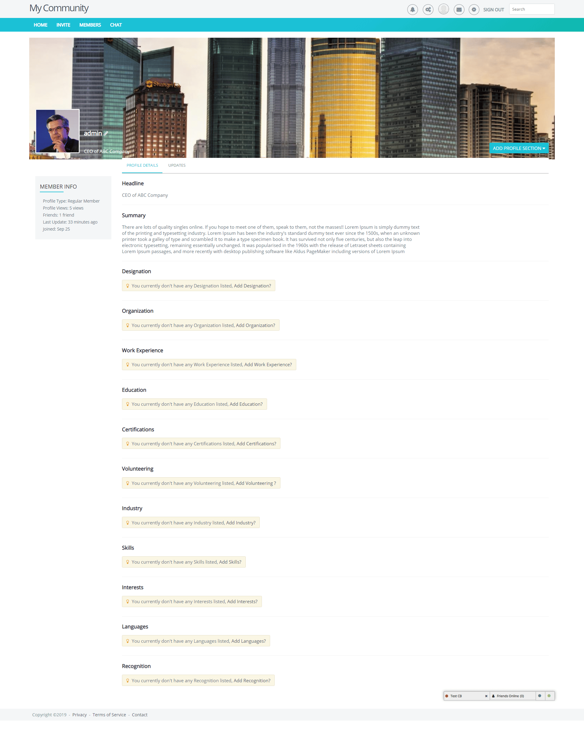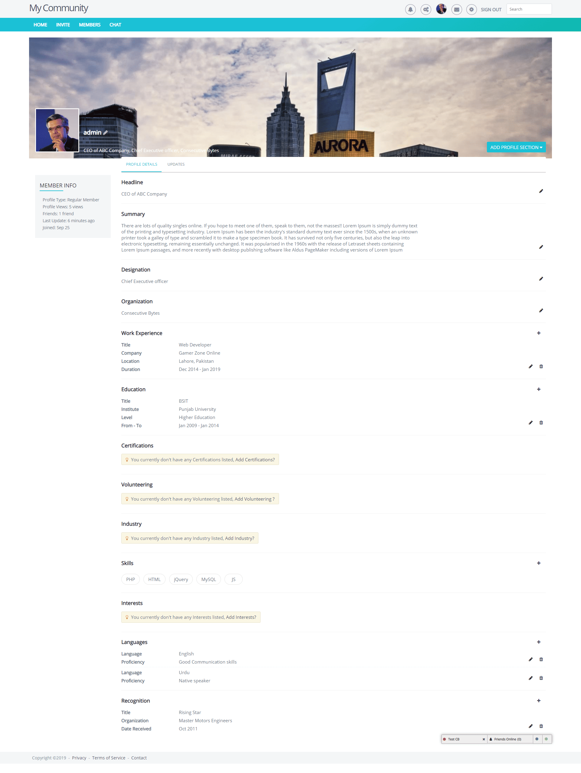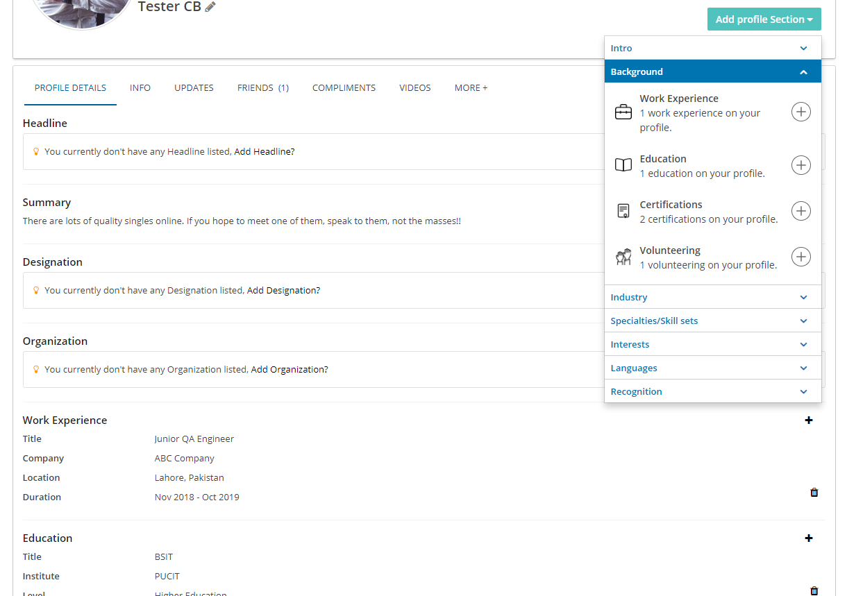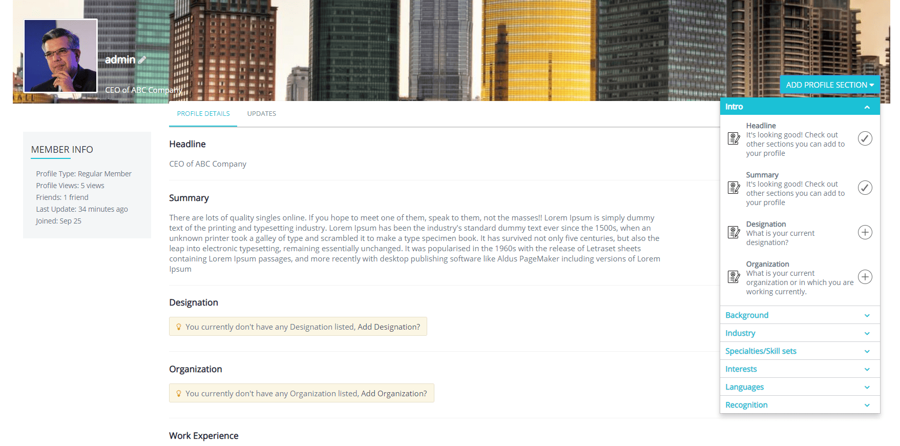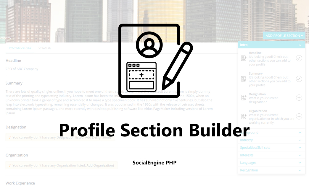 Professional Section or Resume builder for SocialEngine PHP to make your community more professional. Interactive way for your site visitors and members to showcase their expertise and resume in a unique way. Make sections like linked-in profile, such as work experience, education, certification, volunteering, skills, intro, organization, interests, languages, etc.