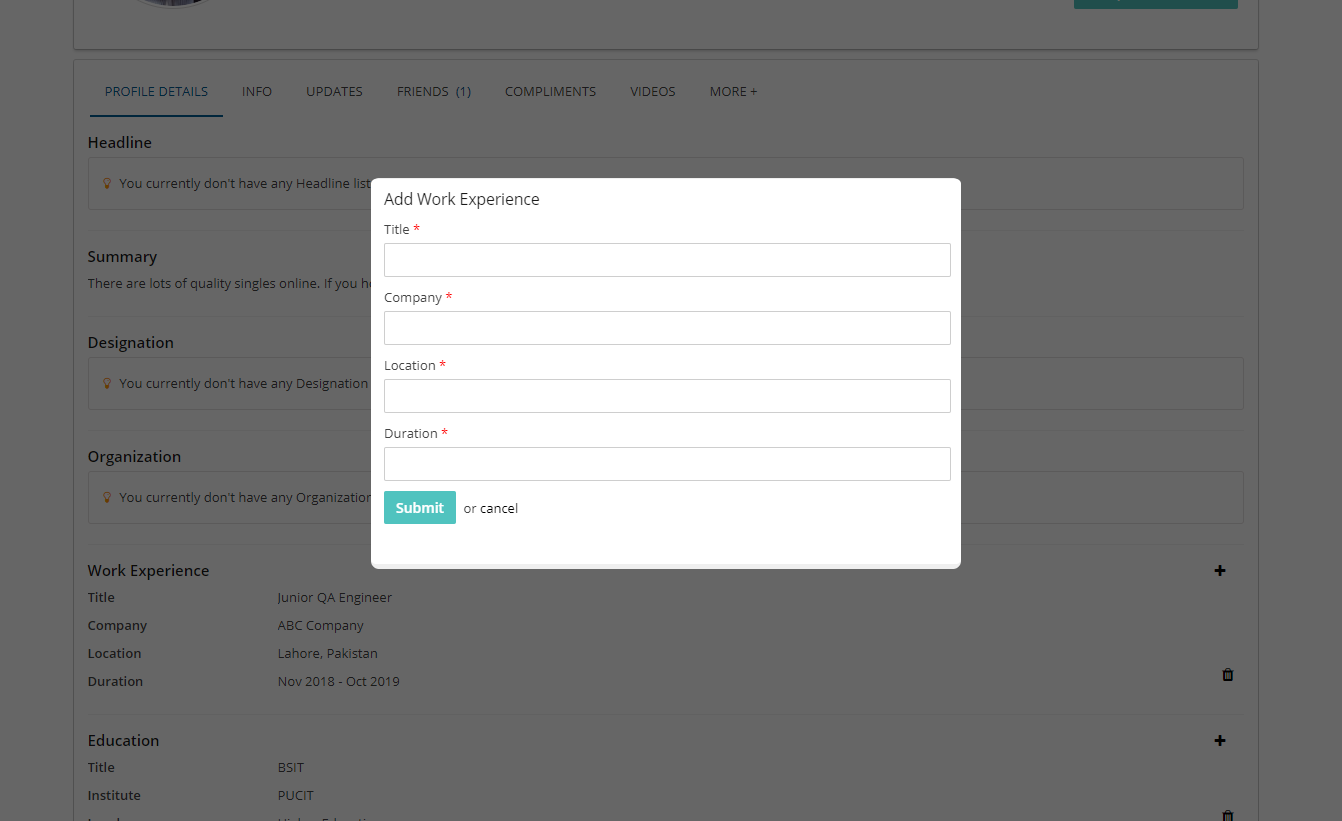 This plugin is very usefull for your SocialEngine PHP website, if you would like to create linkedin type section on your members profiles such as work experience, education, certification, volunteering, skills, intro, organization, interests, languages, etc.
