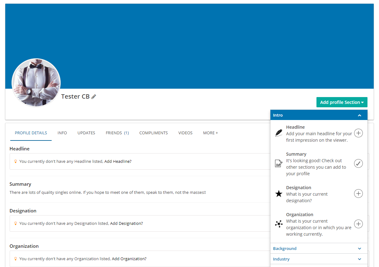 Dropdown section list on user profile provides an attractive way for your visitors to encourage them to enter their professional data. If you use the SocialEngine cover photo widget as latest, it will automatically get on it when placed on the member profile page.