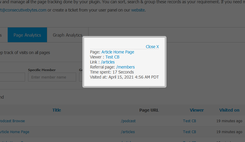When a logged in member visits a page of site, it tracks along its name and page information. Further more, it will keep tracking every visit of the user so you can have the analytics about every user liking.