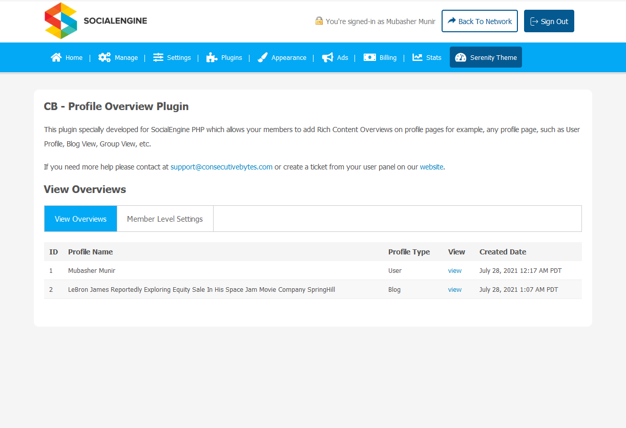 View all overviews in admin which are created by users on the different profile or view pages.